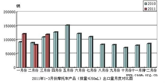 2011年3月份,摩托车产品(排量≤50mL)出口11.93万辆,比去年同期增长了8.99%;出口金额0.56亿美元,与去年同期增长了9.29%。