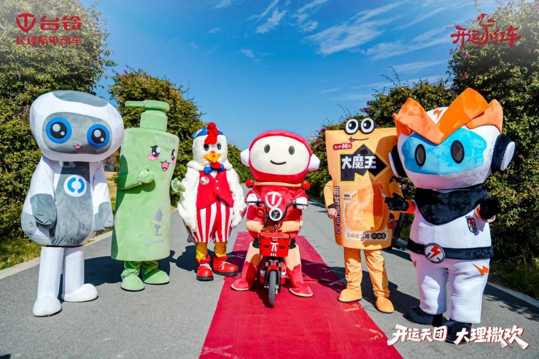 25日当天,台铃IP形象太空人首次公开亮相,携手肯德基奇奇,联合阿道夫天然香、盐津铺子大魔王、荣泰健康阿泰、骇盾新能骇小盾共同组成萌趣十足的品牌IP“开运天团”,和众多达人一起环游大理洱海。