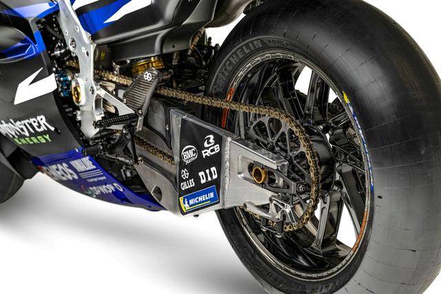 同步亮相的,还有 2026 初步规格的新型 MotoGP 工厂赛车 YZR-M1。这款新型赛车在去年曾以外卡首次亮相赛场,参考官方公布的资料,新的 YZR-M1 搭载一副水冷 V 型四气缸、排气量 1000 cc 的发动机,六档的无缝变速齿轮箱,最大动力输出超过 275 匹(202.2 kw)。车体采用一副铝合金制双翼樑式的、带有多功能可调转向几何系统的 Deltabox 车架,铝合金制的后摇臂是标准装备、可换装碳纤维制的后摇臂。