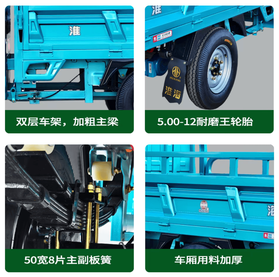 淮海悍将200主打“劲大、高效、耐用”,最大载重可达3000斤,不仅动力强劲,更配备便捷自卸功能,大幅提升运输效率。动力系统搭载1500W加强型电机,配合智能扭矩控制器,低速档位扭矩强劲,满载起步不溜坡;高速档位时速可达45km/h,提速顺畅,满载超车也游刃有余。
