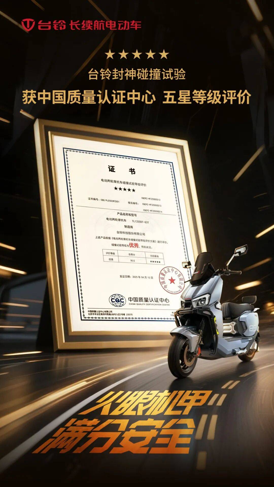 台铃自主研发的蓝极鲸钠电池,以-20℃容量保持率超90%、针刺不起火不爆炸的硬核性能,从核心部件层面破解了低温出行难题。在 “勇闯前人未至之境” 第三季挑战中,台铃集团执行总裁孙木楚驾驶超级钠电车横穿北纬47°极寒无人区,在-30℃环境下完成12小时极限冰封测试,达成139公里超长续航,以真实场景实测完成续航与可靠性的双重突破。与此同时,台铃火眼机甲3·封神完成两轮电动车行业首次碰撞测试,斩获CQC五星等级评价,为行业树立了全新的产品安全检测标准。