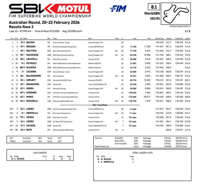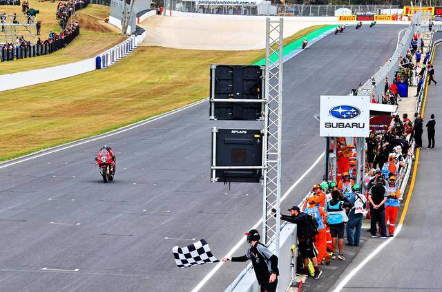 周日举行的第二节正赛在湿地之下展开,22 圈的比赛里、摔车和黄旗频繁出现,并有多达六位车手先后退出了比赛。继续保持着快放的节奏,一马当先的布雷加、最终以超过 11 秒的领先优势夺得了第二节比赛的冠军,在这场揭幕战中取得了全胜。