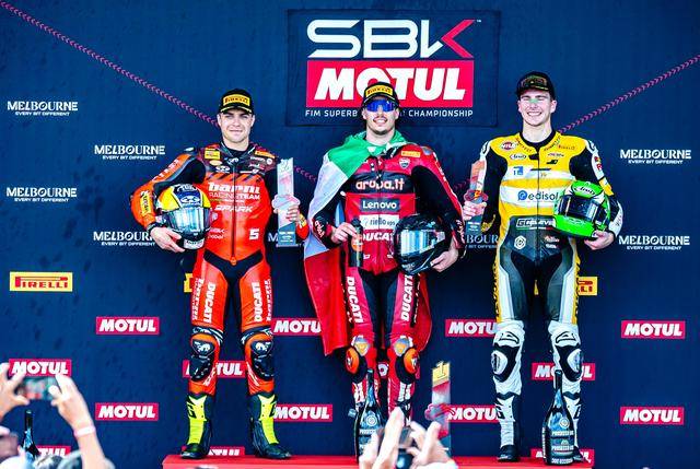 赛程为 10 圈的 Superpole Race 超级排位赛正赛,布雷加在经历前几圈的混战之后,到第 4 圈回到了领先的位置上,最终以接近 3 秒的优势夺得了第一;Bimota 比摩塔工厂车队的两位车手也跟上了节奏,驾驶 47 号车的意大利车手巴萨尼(Axel Bassani)夺得了第二,他的队友队友、驾驶 22 号车的英国车手 A.洛维斯(Alex Lowes)拿到了第三。