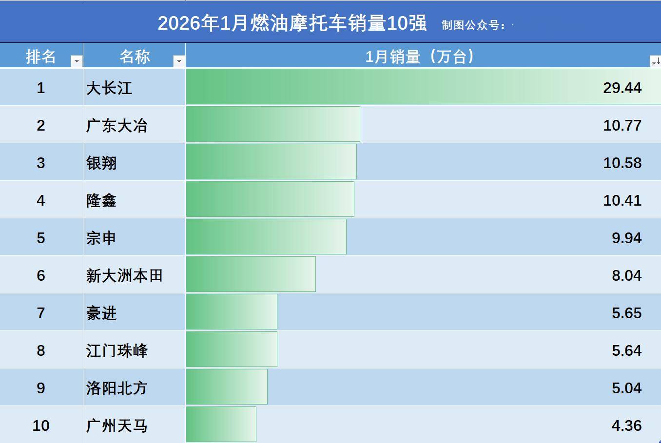 2026年第1个月我国摩企销量首位的厂商,是来自广东江门市的大长江集团。大长江是国内最大的日本铃木摩托技术合作厂商,主要生产豪爵、铃木等品牌的燃油摩托。
