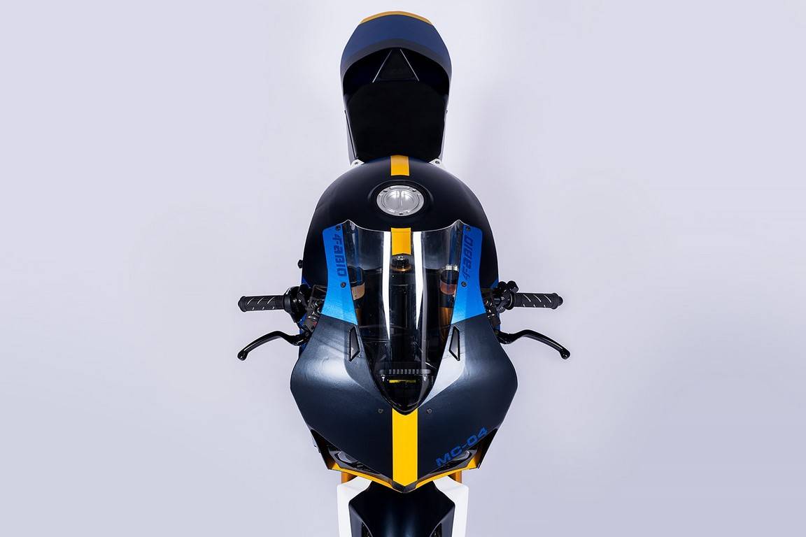 车体外观由Carriero Corse与Colombi Design共同设计,采用碳纤维制作。 前半整流罩造型锐利,搭载雅马哈R1双LED车头灯与整合方向灯,下方运用运动挡泥板与腹板包覆车底。 后方设有摇臂紧贴式轮罩,新油箱造型圆润,车尾线条优雅,多片次车架面板完整包覆,并整合LED照明与Alcantara座椅,最终涂装更呈现惊艳视觉效果。