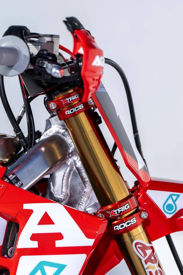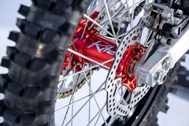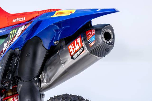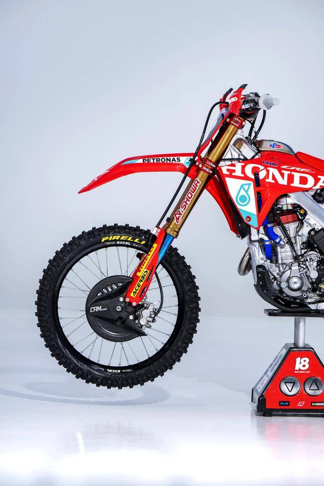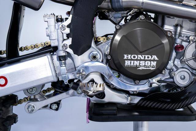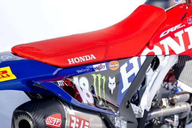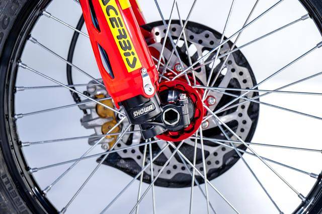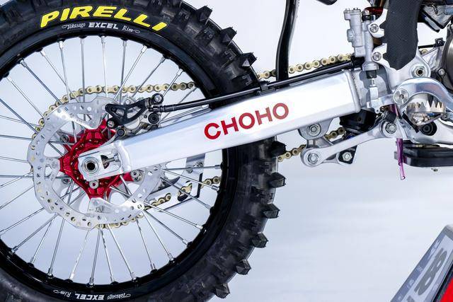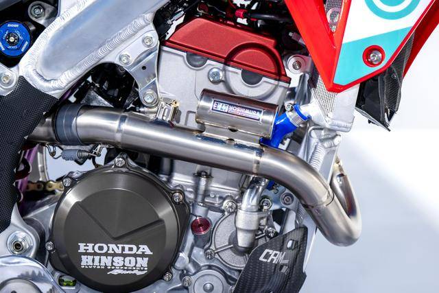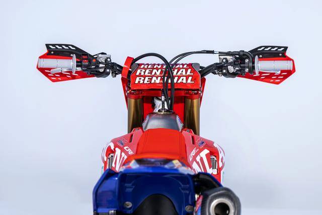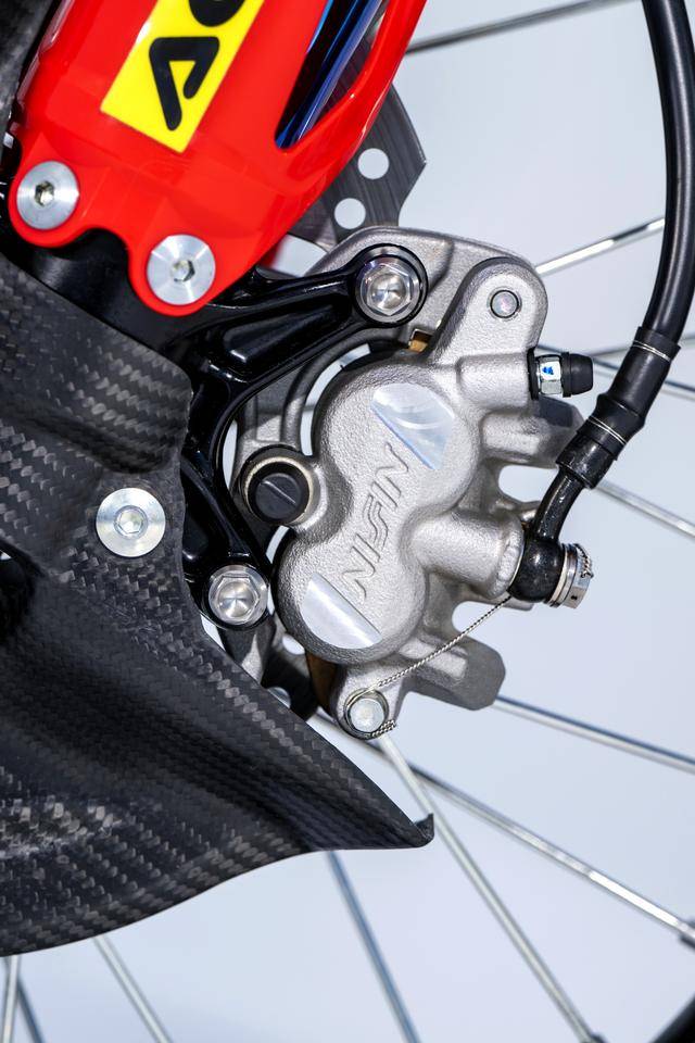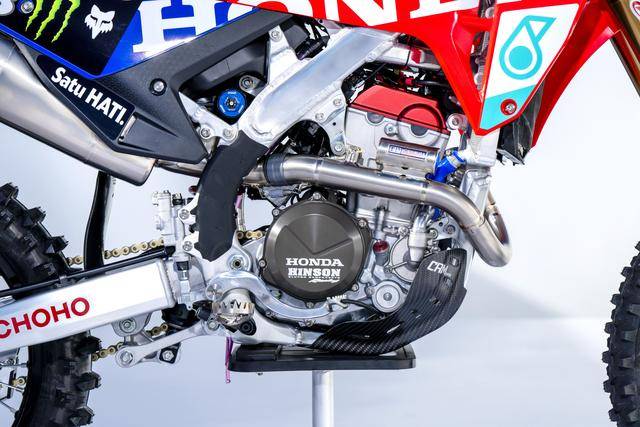 车体方面,采用一副与 CRF450R 同级的、增强了刚性的铝合金车架,Hitachi Astemo 特制的、前叉芯带有钛涂层的 Showa 赛车悬挂系统,Nissin 日信的刹车卡钳,锻造材料经 CNC 加工而成的上下三星(前叉三角台)、前后轮毂等。