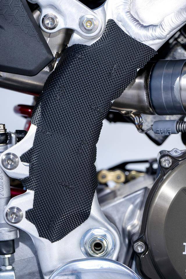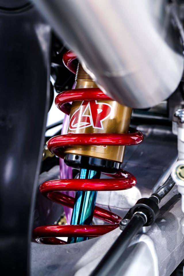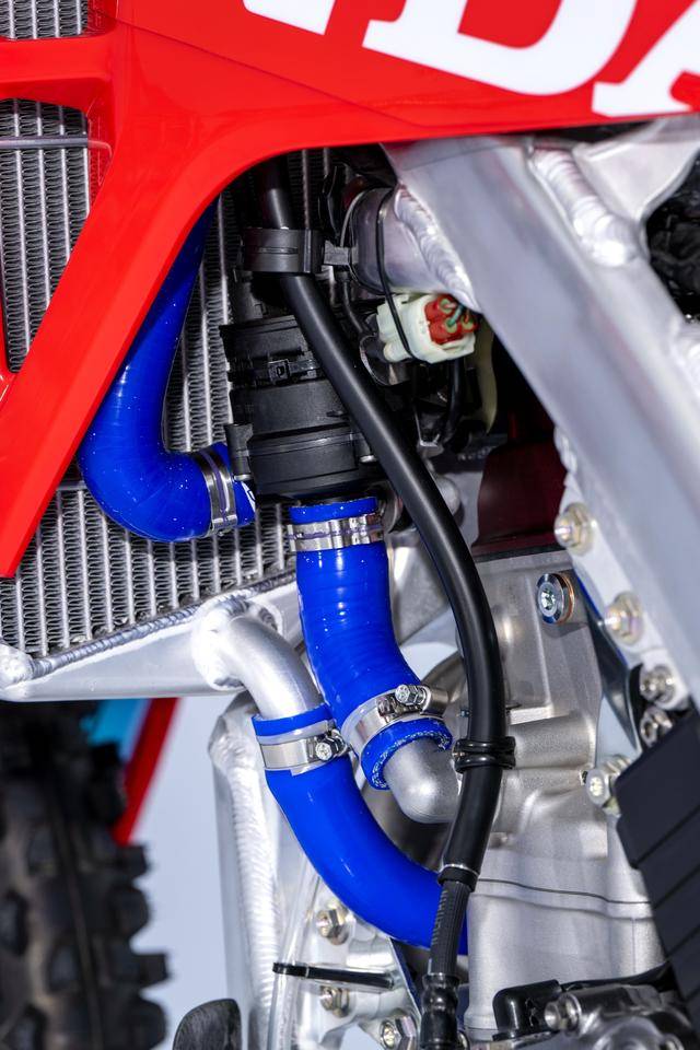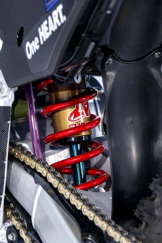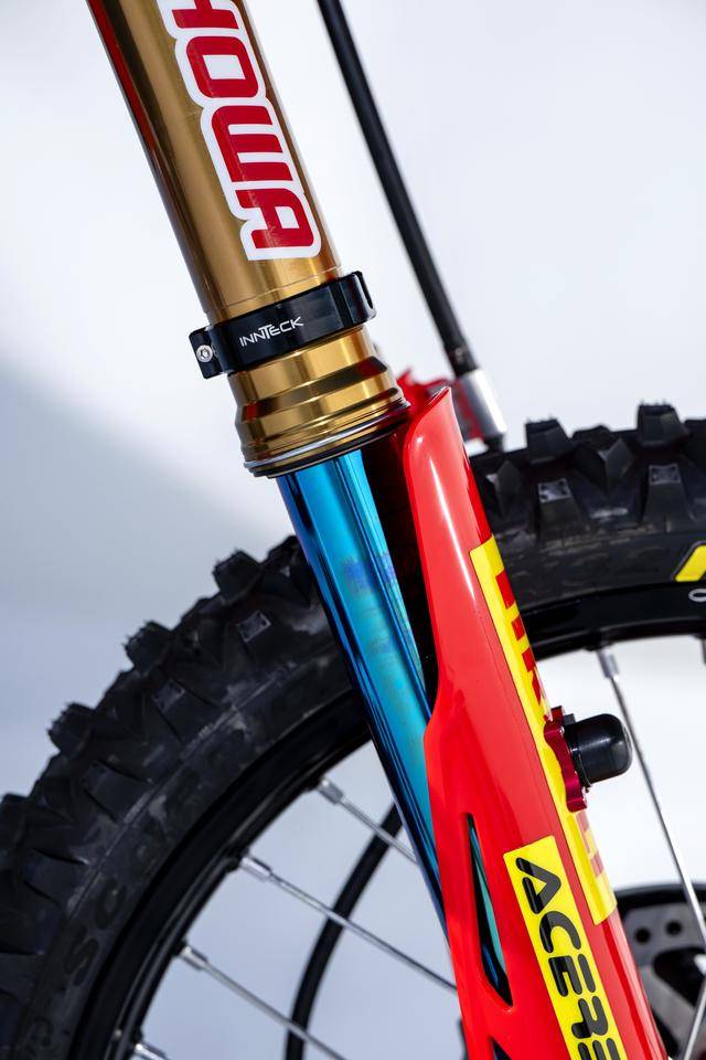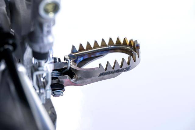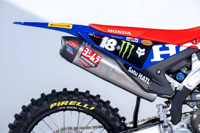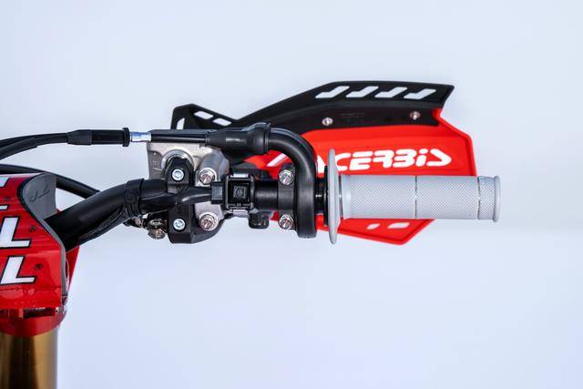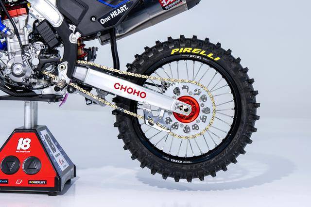 车体方面,采用一副与 CRF450R 同级的、增强了刚性的铝合金车架,Hitachi Astemo 特制的、前叉芯带有钛涂层的 Showa 赛车悬挂系统,Nissin 日信的刹车卡钳,锻造材料经 CNC 加工而成的上下三星(前叉三角台)、前后轮毂等。