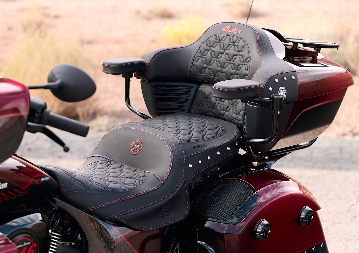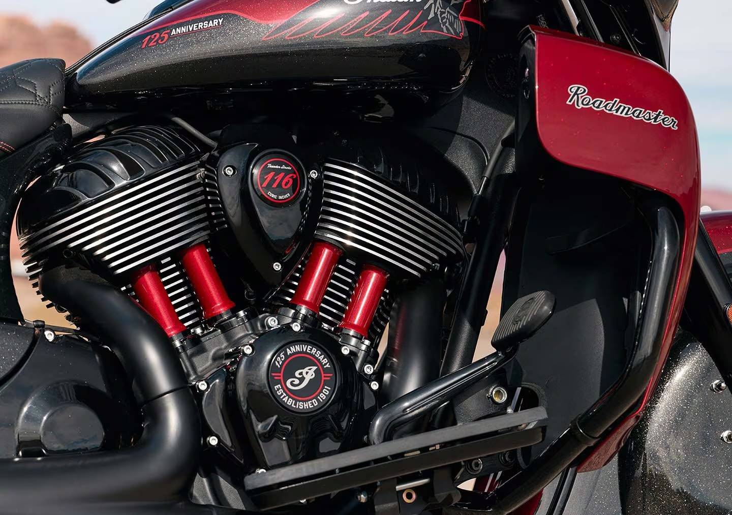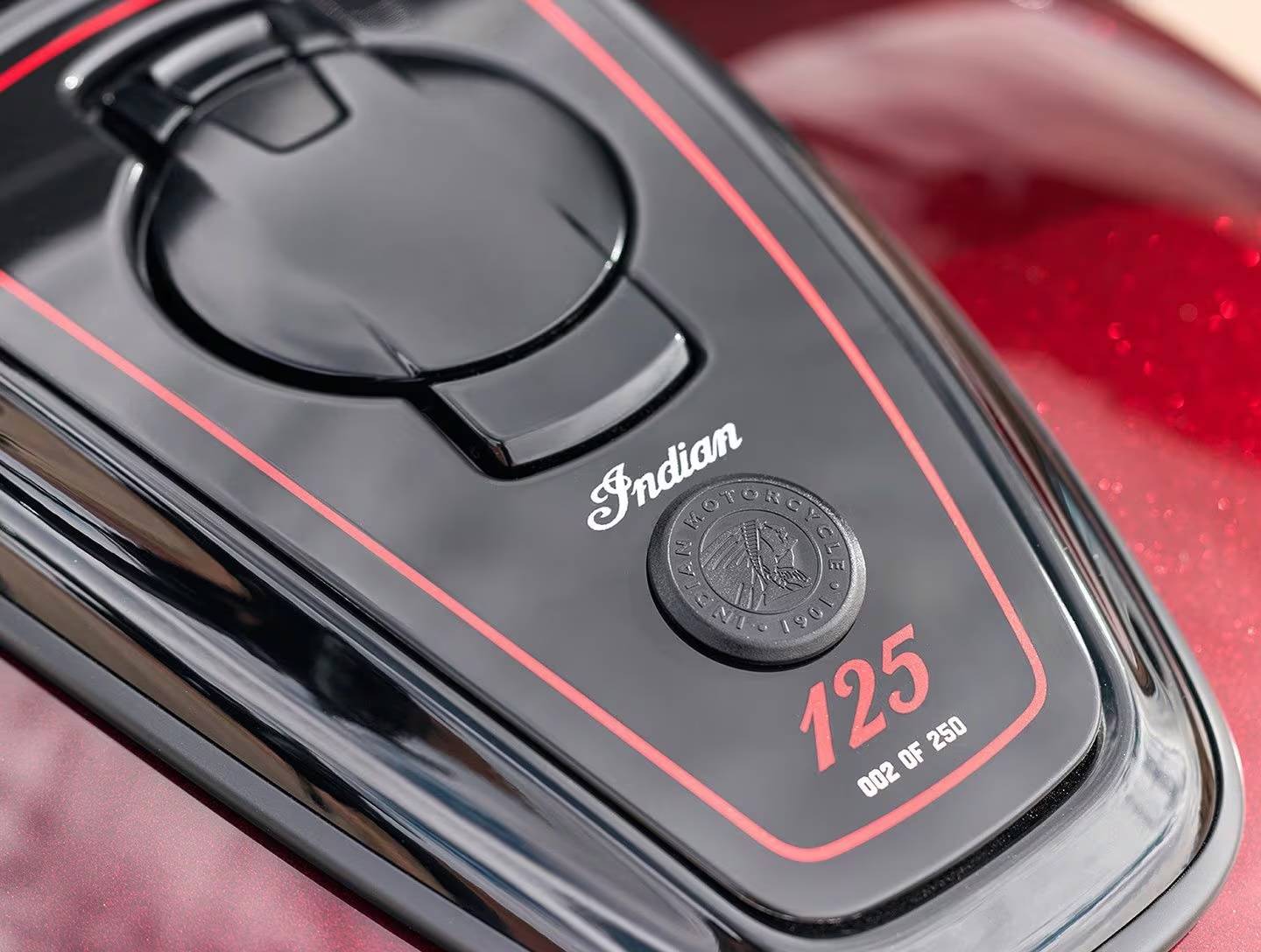 跨越一世纪的火红传承:手工涂装与专属细节这次的 125 周年纪念系列在视觉上极其考究,印第安特别调制了一款带有金属微粒的红黑水晶漆面,以品牌标志性的「印地安红」为核心,透过微小的金属片营造出层次丰富的光泽感,每一辆纪念版车型都拥有手工绘制的金线与专属徽章, 车身上隐约可见「One Hundred Twenty-Fifth-Anniversary」的字样; 此外,每辆车都有独一无二的序列编号,象征其不可取代的收藏地位。