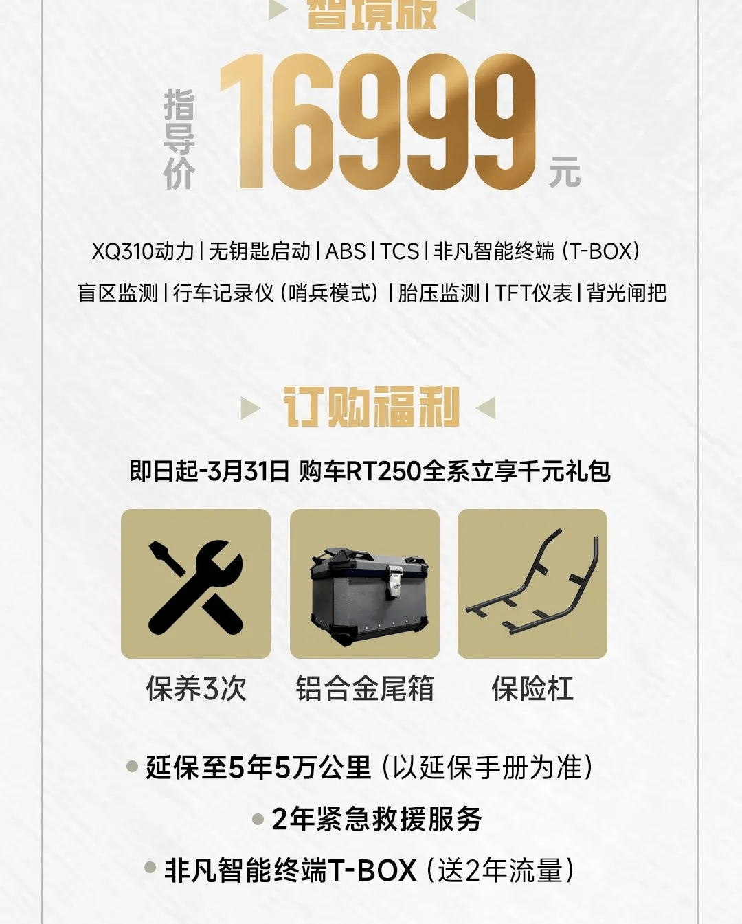 TBOX 非凡车机系统堪称骑行 “智慧大脑”,6.75 英寸 TFT 彩屏支持导航投屏,背光按键与无钥匙启动提升便捷体验,电子围栏、远程车况查询等 20 余项功能一手掌控。动力层面搭载成熟 XQ310 引擎,19.5kW 最大功率,6500转即可爆发24.5N.m 峰值扭矩,动力性能已然成为250级别顶流水准,配合双通道 ABS+TCS 牵引力控制,1400mm 短轴距带来媲美 150 级的灵活操控,171kg 整备质量让城市穿行游刃有余。赫璐品牌半热熔轮胎,硕大的风挡,也是同级里明显偏大的,长途摩旅不用换大风挡了。
