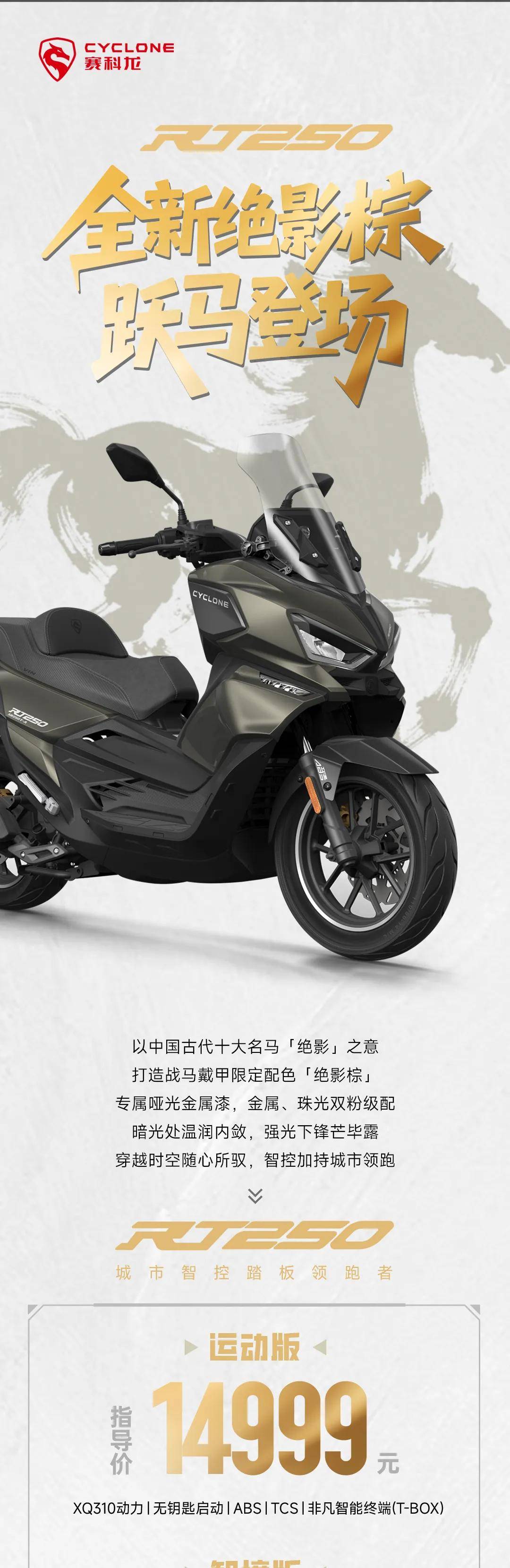 2026 丙午马年,赛科龙 RT250 携「绝影棕」新色踏风而来,以战马之姿重塑城市运动踏板新标杆!标准版14999元,智境版16999元,新色对应加200 元,叠加千元礼包,即可解锁曹操坐骑 “绝影” 同款专属配色,凌厉车身线条在光影间锋芒毕现,人车共情间尽显 “亦战友、亦爱驹” 的骑行情怀。