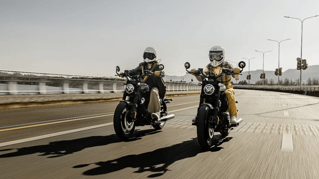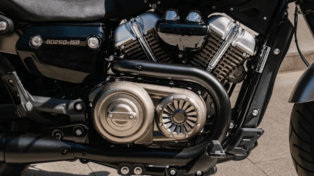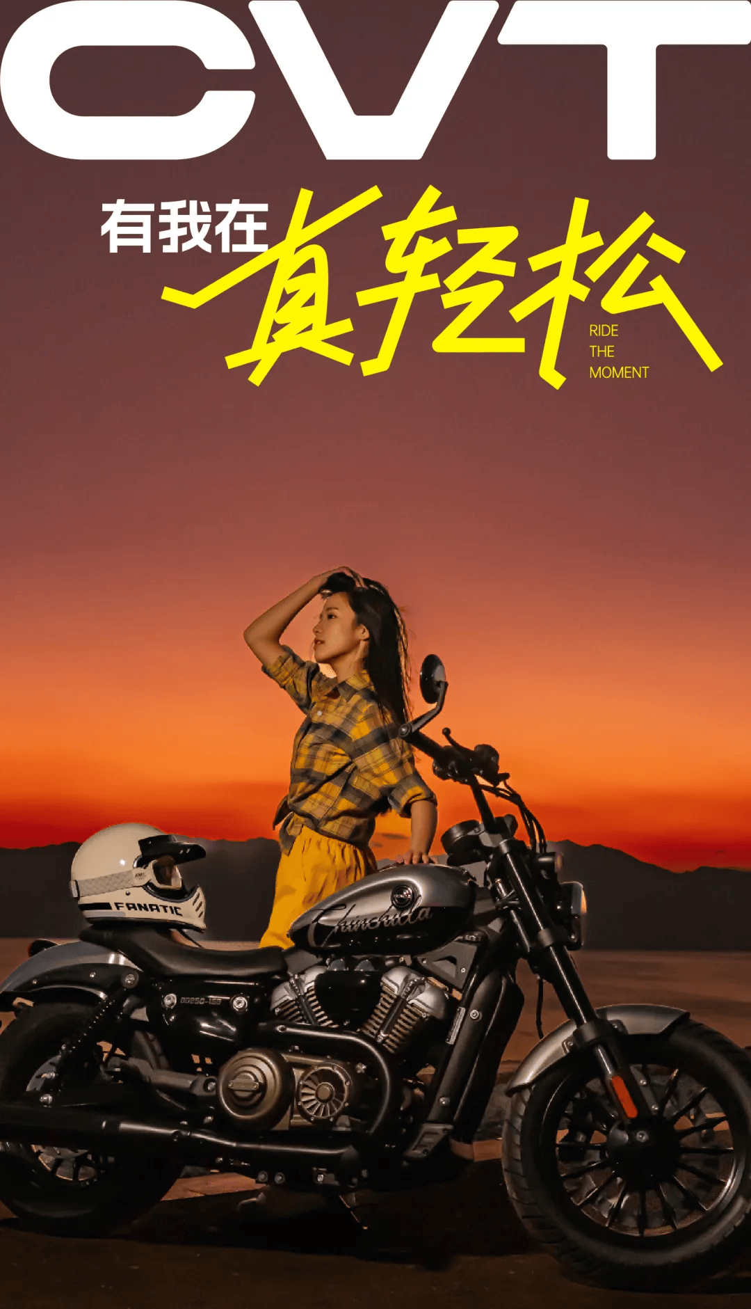 核心件保持不变,摇篮式钢管车架, V 型双缸平衡轴水冷引擎,全新升级为成奔达成熟自研CVT 无级变速系统,动力输出丝滑无顿挫,叠加超低震动,动力依然是19千瓦/9000转,25牛米/5500转,既保留复古巡航的澎湃声浪,又省去油离配合的繁琐操作,充沛的低扭,踏板车一样的上手难度难度,让新手无门槛驾驭。