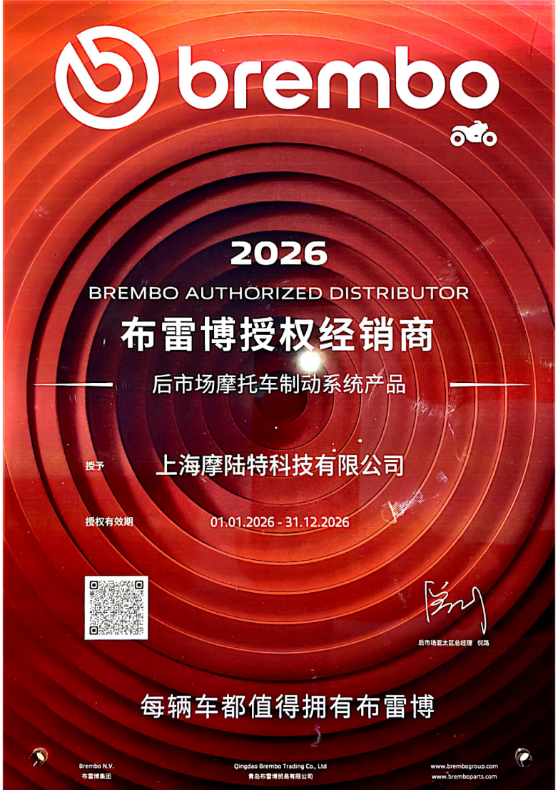 近日,全球高性能制动系统标杆品牌布雷博(Brembo)正式官宣战略升级,授予上海摩陆特科技有限公司(以下简称“摩陆特”)山西、陕西、云南、江苏、河南、黑龙江、吉林、辽宁、甘肃、青海、西藏、宁夏十二省(自治区)一级经销权,授权自2026年起正式生效。这一举措标志着双方自2025年开启合作以来,信任羁绊与战略布局的全面深化,更彰显了布雷博深耕中国摩托车后市场、完善区域服务网络的坚定决心。