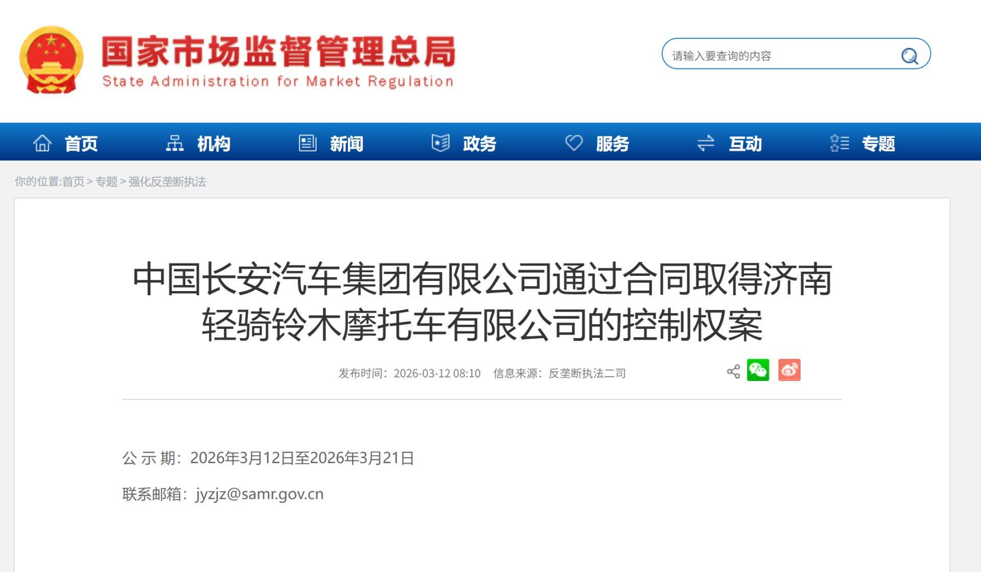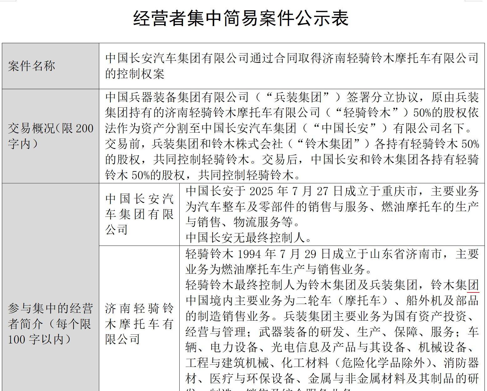 日前,《每日经济新闻》记者从国家市场监督管理总局官网获悉,反垄断执法二司已正式对“中国长安汽车集团有限公司通过合同取得济南轻骑铃木摩托车有限公司的控制权案”进行为期10天的公示。