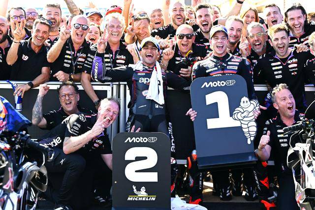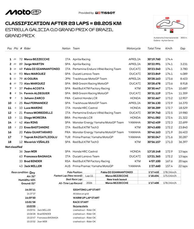 周日(三月 22 日)举行的正赛,原定 31 圈的比赛、因为各种的状况而被缩减到 23 圈。延续着此前的强势,贝泽奇在取得领先位置之后、就以快速的节奏拉开与后车的距离,上半段比赛结束时,他与后车的距离接近 2 秒;后半段的比赛里,贝泽奇都没有放松,且把领先优势进一步扩大。最终,他顺利夺得了 MotoGP 正赛的冠军,取得了新赛季开赛以来的两连胜。