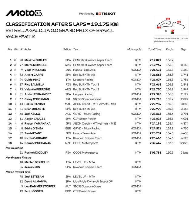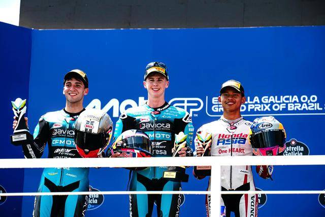 Moto3 级别,首次的发车、到第 15 圈时因为意外而被红旗终止。重新发车、比赛缩减到只剩 5 圈。彼此都拼尽全力的角逐之后,驾驶 28 号车的西班牙车手奎尔斯(Maximo Quiles)与队友、97 号车的阿根廷车手莫雷利(Marco Morelli)几乎同时冲线,奎尔斯夺得了冠军、连续两站比赛都登上颁奖台,莫雷利获得亚军。季军之争非常激烈,驾驶 9 号车的印尼车手普拉塔马(Veda Pratama)最终拿到了季军,历史性地拿到了个人在 GP 职业生涯的首次颁奖台。