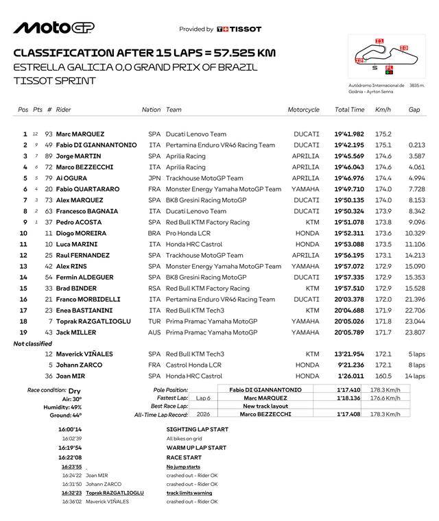 赛程为 15 圈的 Sprint 冲刺赛,从排头位发车、早早就取得领先位置的吉南托里奥,与同一制造商阵营的马昆斯进行了一场全程的缠斗。到比赛的后段,马昆斯把握机会成功超越前车,并最终守住领先的位置率先冲线,夺得了冲刺赛的第一;落后前车 0.213 秒,吉南托里奥拿到了第二;状态持续扶苏中、89 号车的西班牙车手马丁(Jorge Martin)拿到第三。
