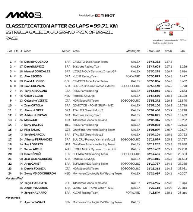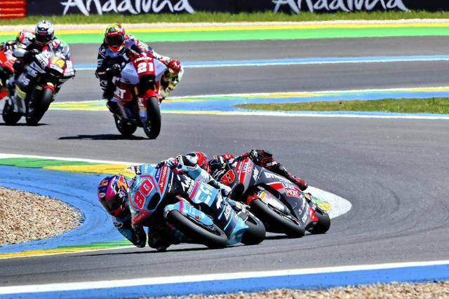 Moto2 级别的赛程为 26 圈,经历了上半段比赛的纠缠之后,驾驶 96 号车的西班牙车手霍加多(Daniel Holgado),64 号车的西班牙车手穆诺兹(David Munoz),成为了后半段比赛里、冠军的主要争夺者。尽管在比赛的后段、一度追了回来并取得领先,但今年首次升级到 Moto2 的穆诺兹最终没能守住带头位置,霍加多最后夺得了冠军,穆诺兹获得了亚军、首次登上 Moto2 级别的颁奖台;18 号车的西班牙车手冈萨雷斯(Manuel Gonzalez)拿到了季军,连续两站都登上了颁奖台。