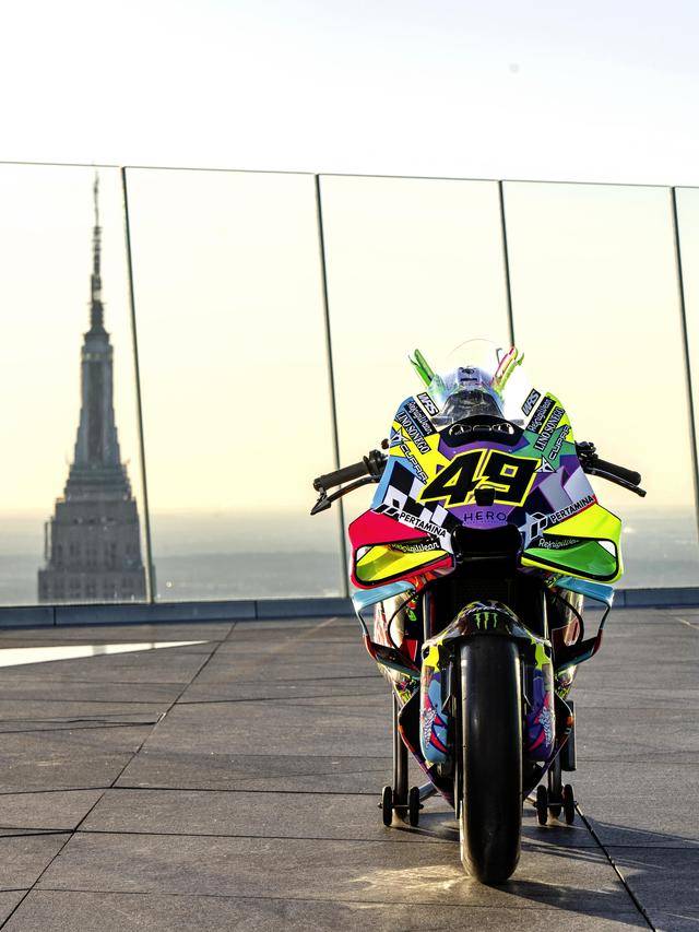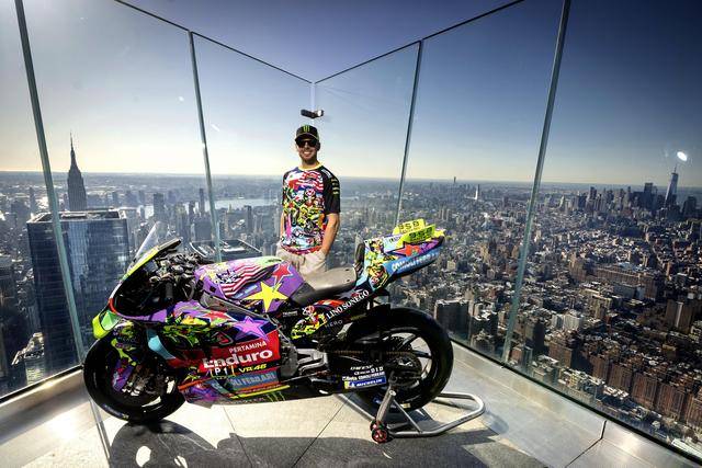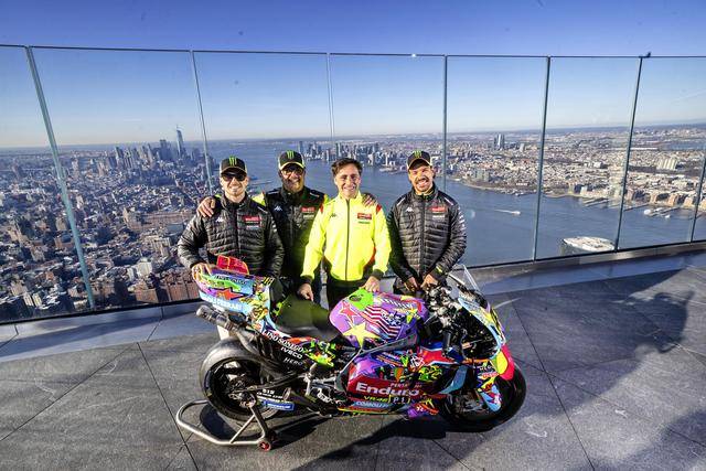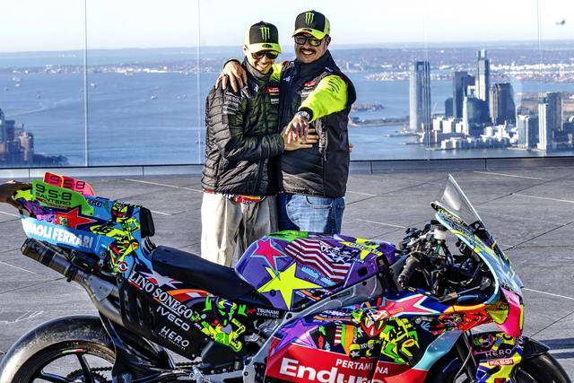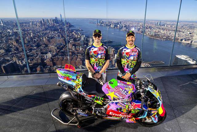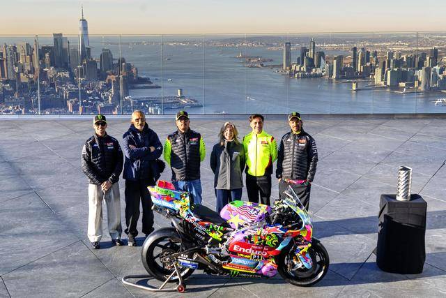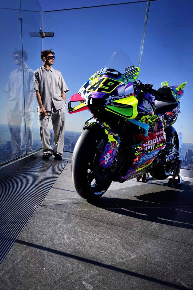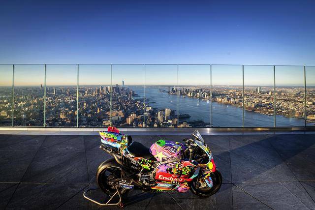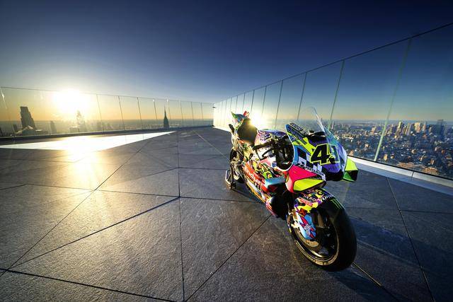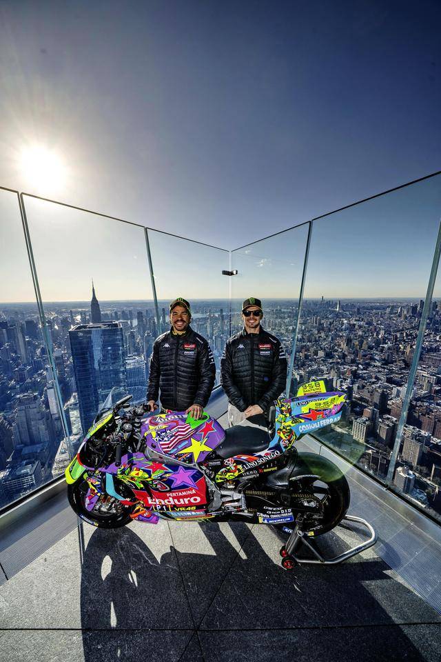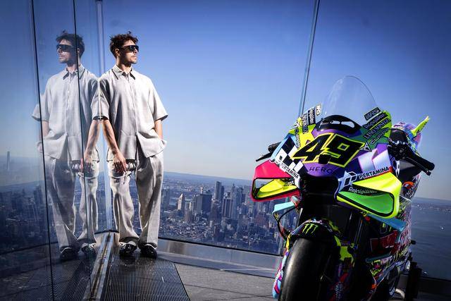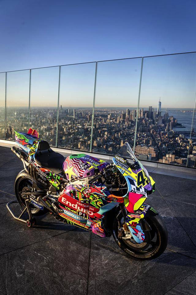 美国当地时间昨天(三月 24 日),纽约哈德逊广场的 Edge 观景台,VR46 于这个当地最高点展示了他们将在本周美国站比赛中所采用的、独特设计的车队图案。该图案由德鲁迪(Drudi Performance)设计,以类似于涂鸦的形式、在 Desmosedici GP 赛车上,展现 VR46 车队过去的历史,此外包含有车队的创始人罗斯(Valentino Rossi),和他的挚友兼项目指导者萨卢奇(Alessio Salucci)的元素。整个图案的风格令人联想到波普艺术,主要的人物元素置身于色彩缤纷的画面之中,而荧光黄仍是其主色调。