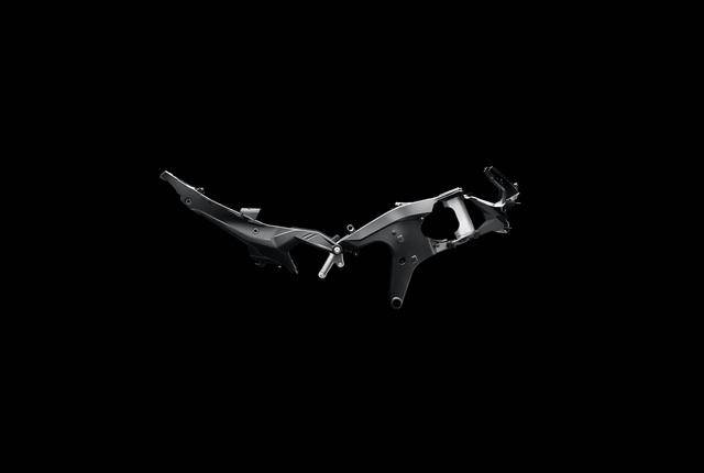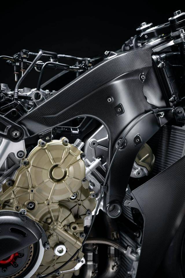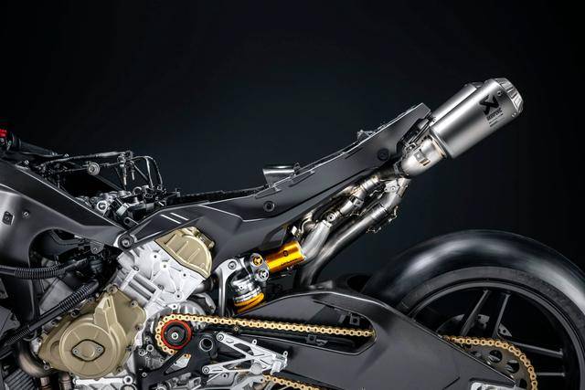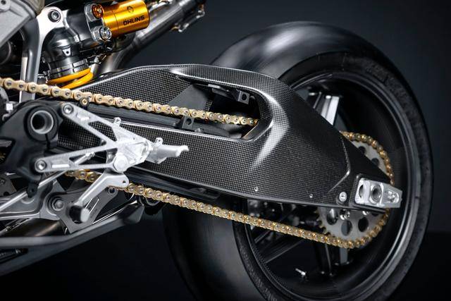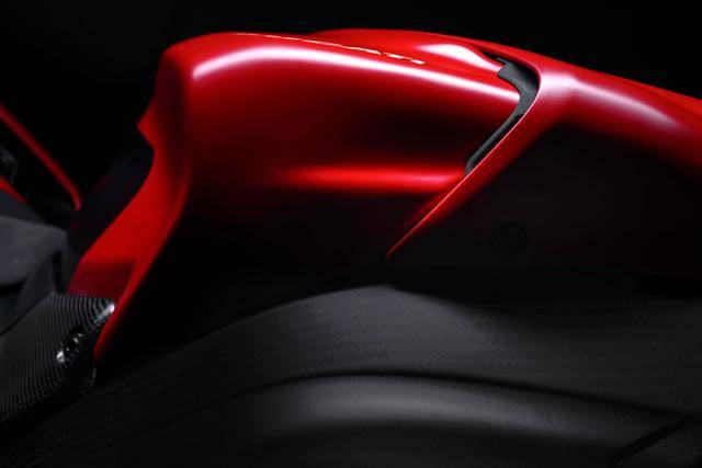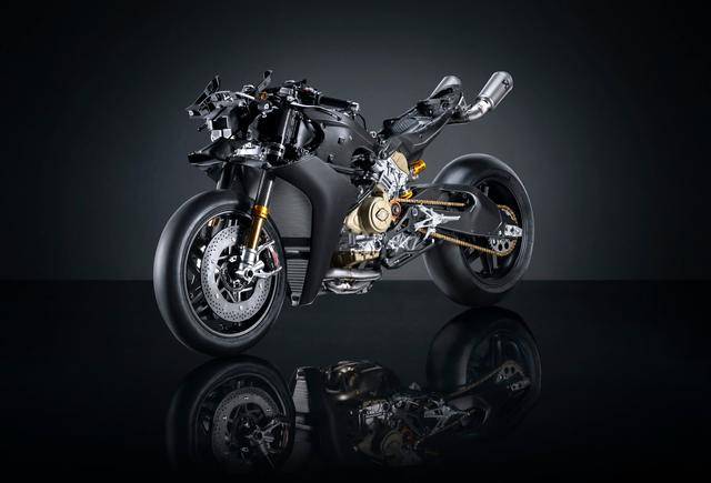6、整个底盘结构都采用了碳纤维制成:车架、后摇臂、后尾樑(副车架)和前后车轮均采用了碳纤维材料制成,其工艺源于 MotoGP 和 F1相同的技术。碳纤维前车架、其重量比 Panigale V4 上的铝制前车架轻了大约 17%,车架刚度经过重新校准,以提高转向的抓地力,以及能够自然贴合弯道线路中的车身倾侧度。双后摇臂有着一个比铝制部件轻了大约 21% 的整体结构,同时保持了等效的横向和扭转刚度,以确保在进行转向操作时、可以获得来自轮胎的最大抓地力;