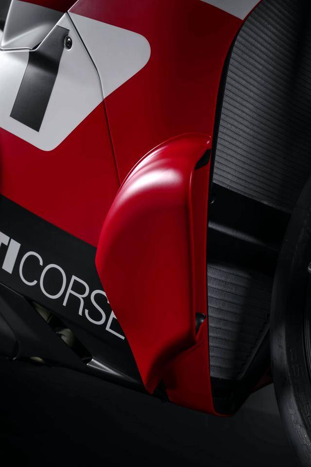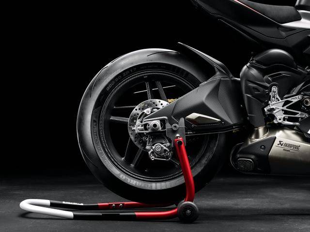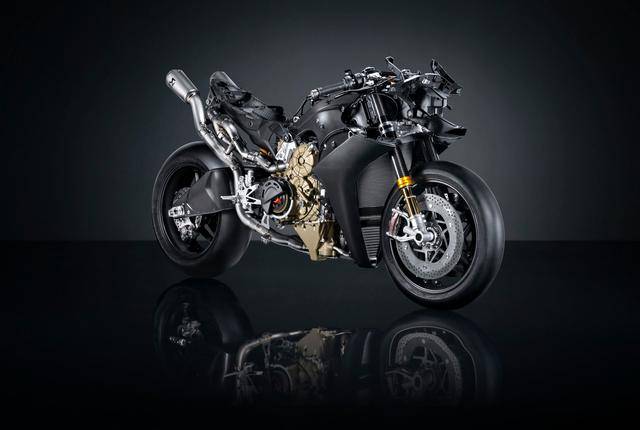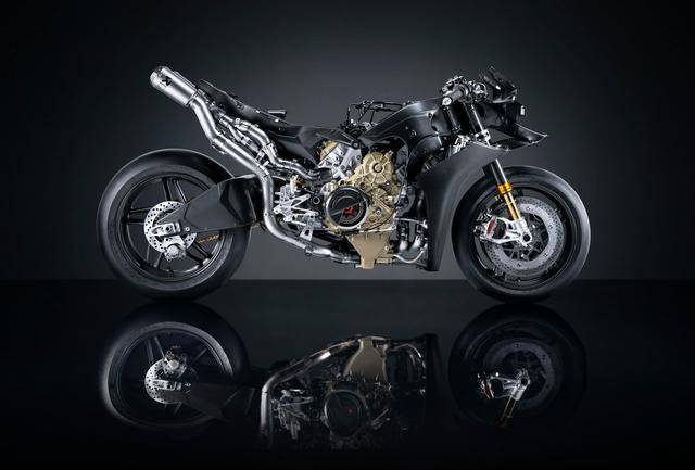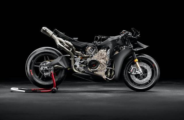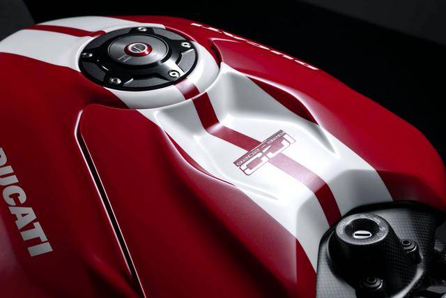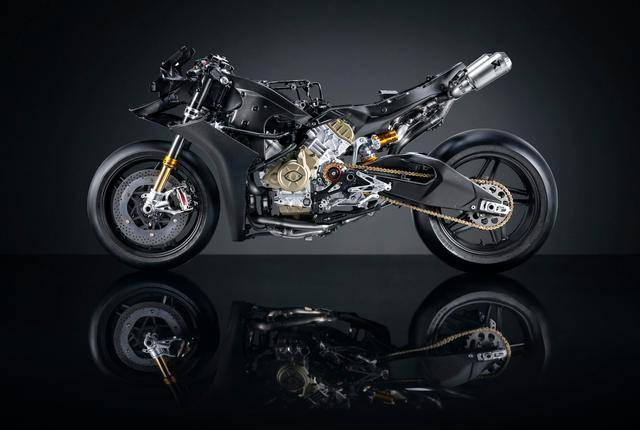 7、全车不含燃油之下的整备重量为 173 公斤,换装了赛车排气系统时、重量进一步下降至 167 公斤(同样是不含燃料之下的整备重量,量产型的 Panigale V4 为 191 公斤、V4 S 为 187 公斤);