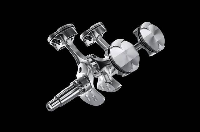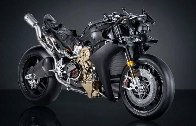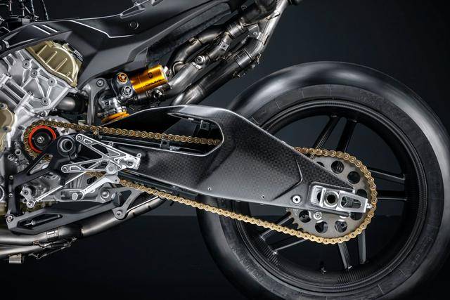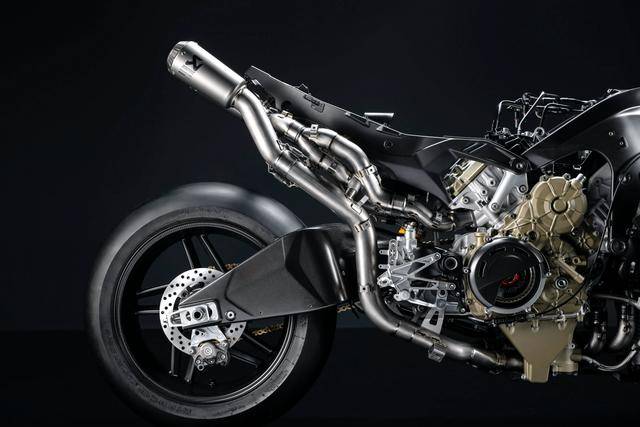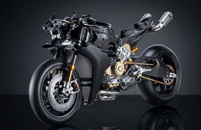 3、整个动力单元比换装了干式离合器的原版 Panigale V4/V4 S 发动机、轻了大约 3.6 公斤。除了多处换上了钛合金制的组件之外,曲轴的配重球体采用了钨合金嵌入件、以代替原本的全钢结构,该设计以更小、更紧凑的插入件设计,实现相同的平衡效果,且可承受更大马力输出所带来的、额外的强度需要,在进一步降低了曲轴重量的同时,并产生一个更快的转速提升、油门响应更直接的效果;