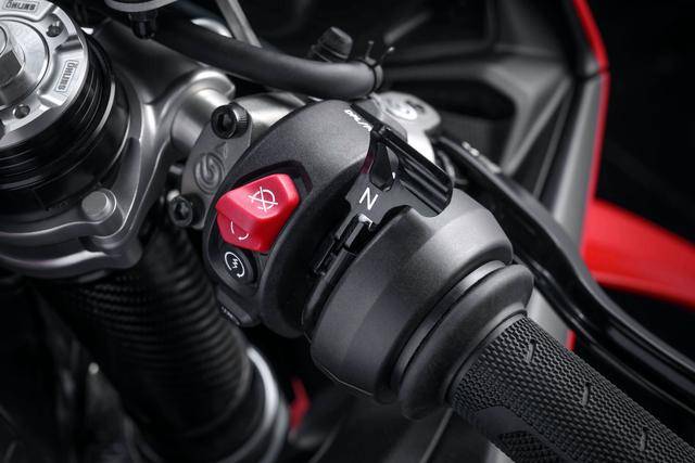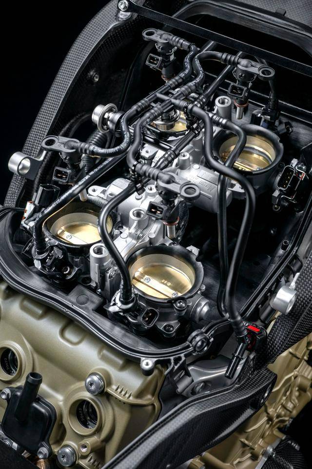 4、换装了节气阀口径为 56 mm 的电子燃油喷注系统(Panigale V4/V4 S 电喷系统的节气阀口径为 52 mm),进气歧管的长度也经过优化以提高进气效率;
