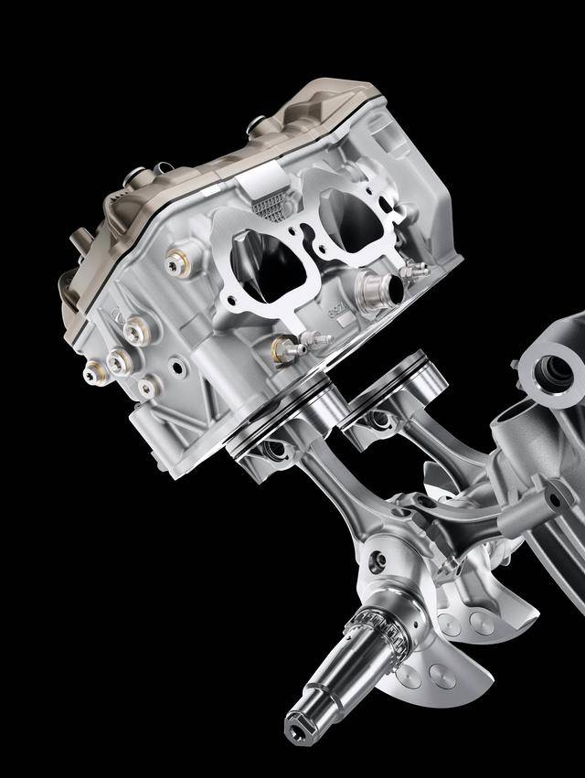 2、该动力装置的配气结构(气缸头)采用了与 Desmosedici Stradale R(Panigale V4 R 所搭载的 998 cc 发动机)相同的配置,采用了直径为 34 mm 的钛合金制进气阀、27.5 mm 的钢制排气阀,进气和排气通道口也经过了如同赛车那样的抛光;活塞采用了单片气环(一般的可上牌车型都采用两片的活塞气环 + 一片油环);并采用了 18 mm 超大直径的活塞销,以应对功率的增加;