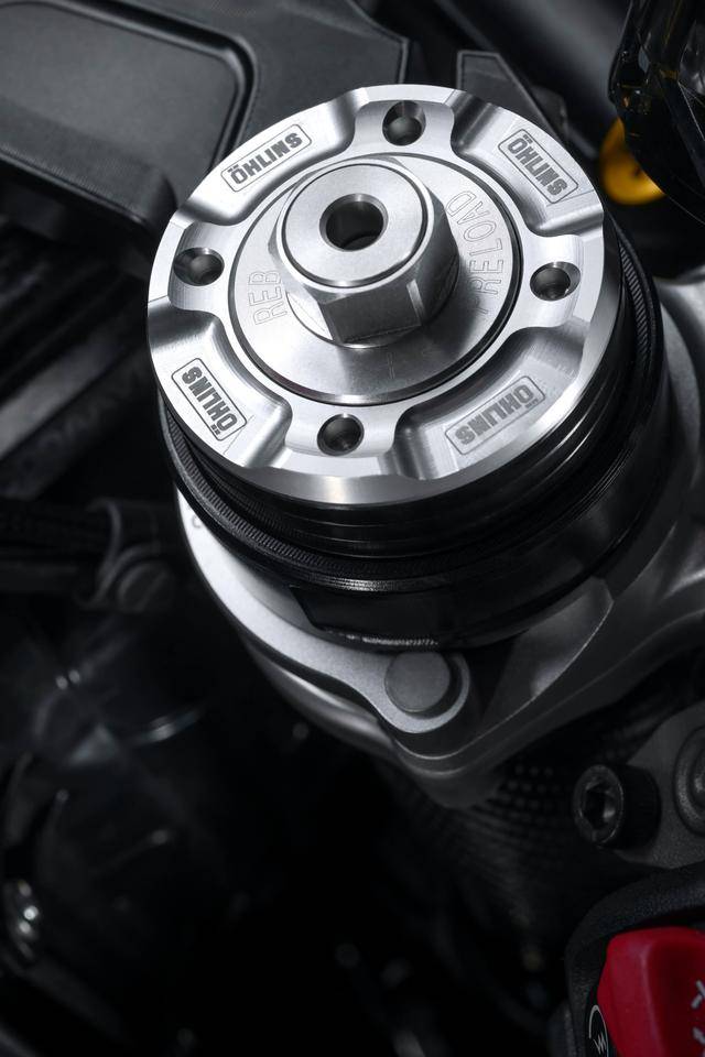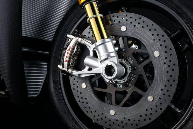 8、新的 2027 Superleggera V4 百年版是全球第一辆标配了 Ohlins 奥林斯 NPX 25/30 碳纤维叉筒倒立式前叉的可上牌车型。与传统金属制叉筒的同类前叉相比,这套碳纤维叉筒的倒立式前叉可以最大限度地降低重量,而这一设计的好处,是在转向操作和前端灵敏度方面,产生一个明显的改善;后减震采用了奥林斯的 TTX36 GP LW,该减震采用了特种钢制的、轻量化设计的弹簧,减震阀门以 MotoGP 衍生的技术开发而成,有着极佳的、应对轻微颠簸时的处理能力,与车体相连的后减震连杆也以钛合金制成。厂方称,这是将 MotoGP 技术呈现在爱好者面前的悬挂组合;