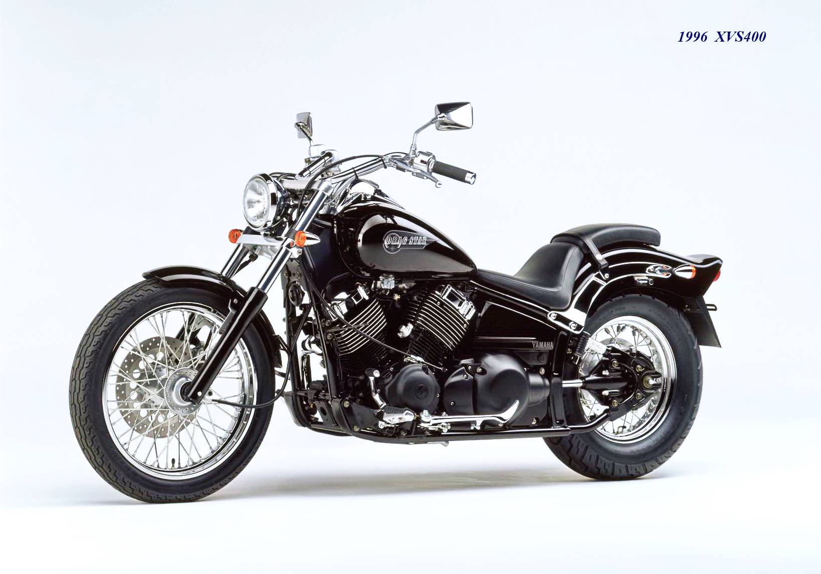 第一款的 1996 XVS400 Drag Star 搭载一副全新开发的风冷 V 型 75 度两气缸(上一代的 XV400 采用 V 型 70 度的设计)、SOHC 每气缸两气阀的发动机,缸径、行程为 68 mm x 55 mm(与 XV400 相同),排气量 399 cc,配备了五档的变速齿轮箱、这一级别里标志性的轴传动,最大马力输出 33 匹/7500 rpm(上一代的 XV400 为 40 匹/8500 rpm),峰值扭矩输出 32 N.m/6000 rpm。