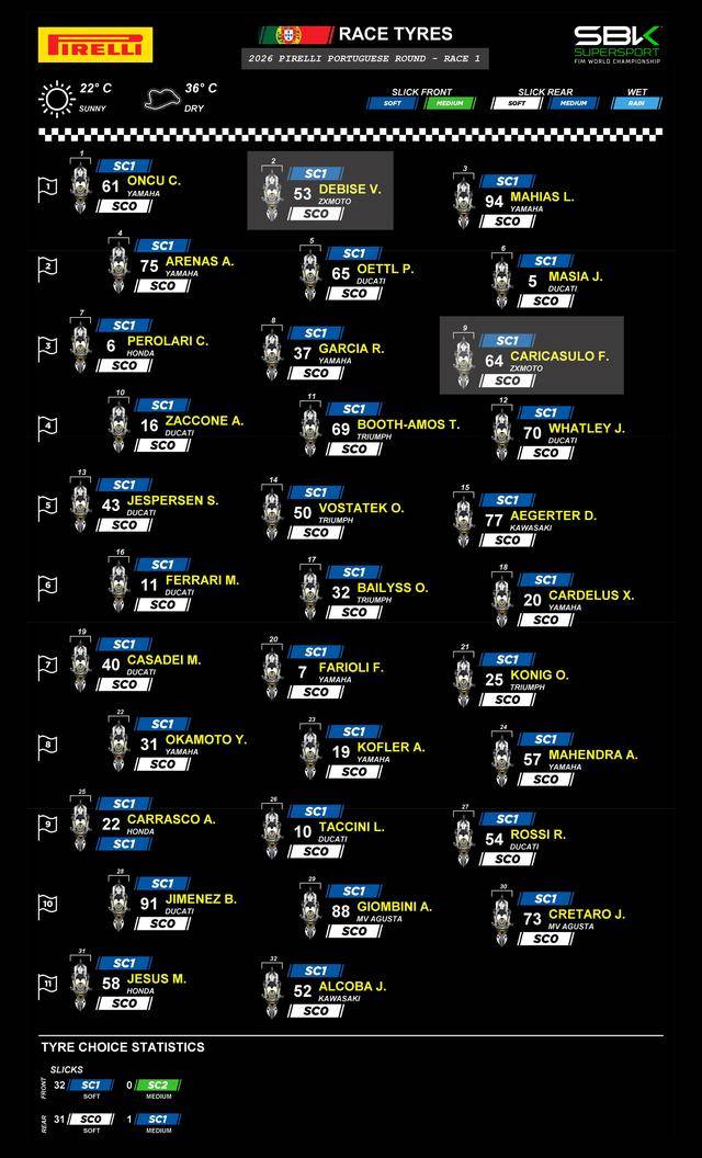 下面的图片,2026 WorldSBK 葡萄牙站,WorldSSP NG 级别两节正赛的轮胎选择、和比赛现场(资料图片)。