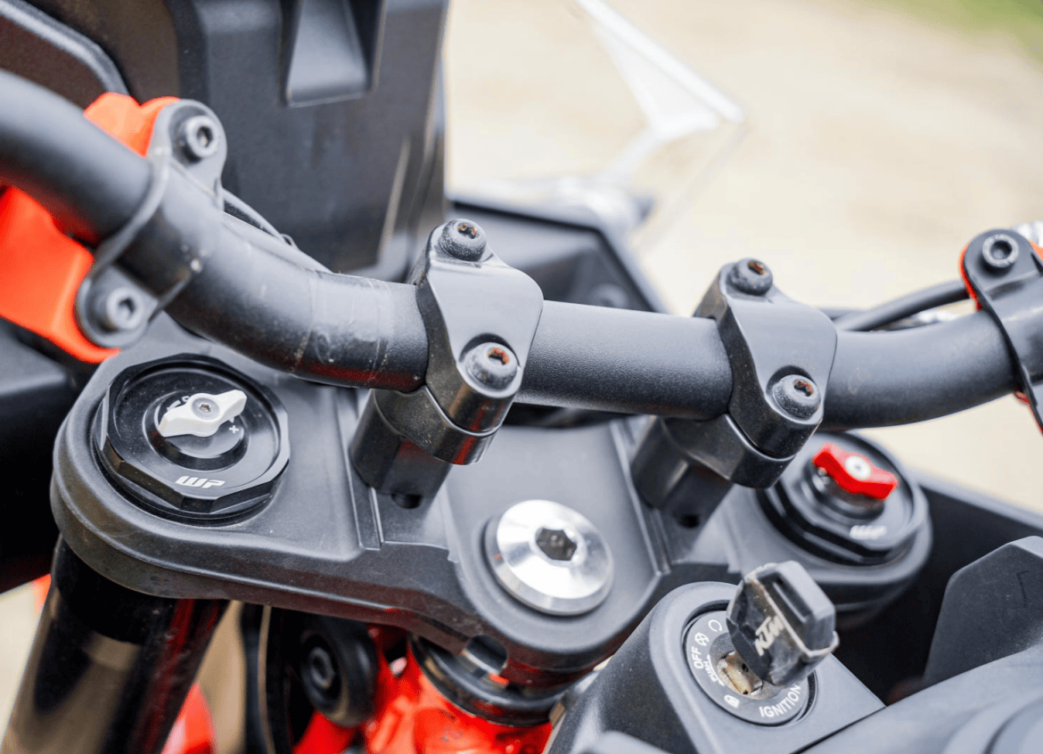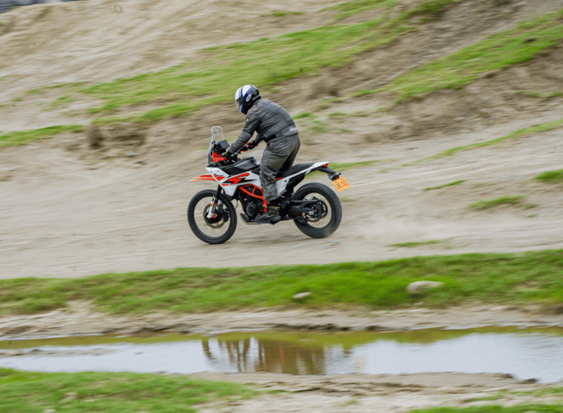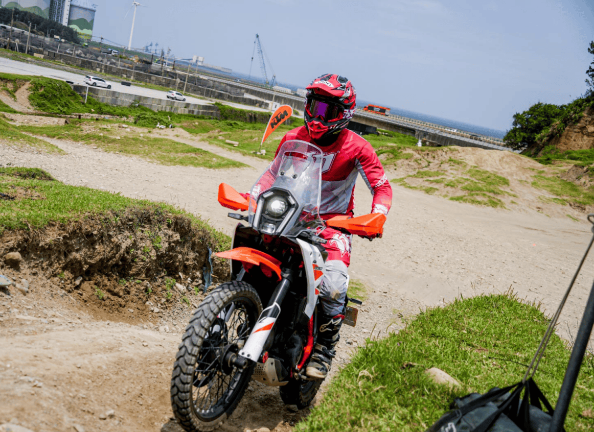 实战体验:ADVENTURE R 的野性与 SMC R 的滑胎灵魂在实际跨上 390 ADVENTURE R 之后,第一印象是那份高耸的霸气,虽然 885mm 的座高数据听起来惊人,但实际跨坐上去,由于避震器的初始设定较为硬朗,下沉量并不如传统日系越野车那么多,180 公分身高也仅能以前脚掌着地,若是 175 公分左右的骑士,建议要练习以单脚着地为主。