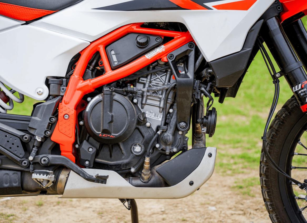 动力表现方面,这具全新 399c.c. 引擎延续了 KTM 偏爱高转速的特性,在陡坡上,骑士可以很放心地用一档高转速一路冲刺,完全不用担心动力突然断掉导致倒车;然而,在高难度的低速平衡或原地回转时,骑士需要更细腻地掌握离合器,否则这类高压缩比的单缸引擎在低转速时较容易发生熄火状况。