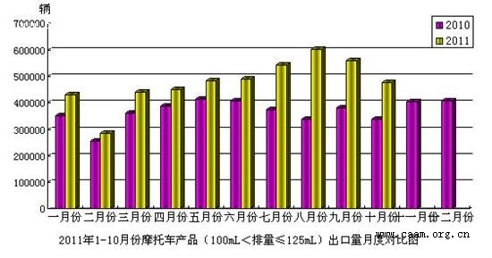 据海关提供出口统计数据显示,由中国汽车工业协会编辑整理,现将2011年10月份摩托车产品(100mL<排量≤125mL)出口情况分析如下: