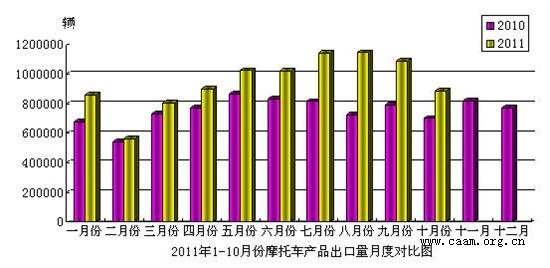 2011年10月份,摩托车产品出口88.68万辆,比上月下降了18.59%,比去年同期增长了26.52%;出口金额5.24亿美元,与去年同期增长了49.58%。