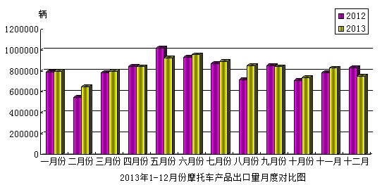 1-12月份,摩托车产品累计出口987.78万辆,比去年同期增长了1.87%;累计出口金额52.68亿美元,比去年同期增长了3.93%。