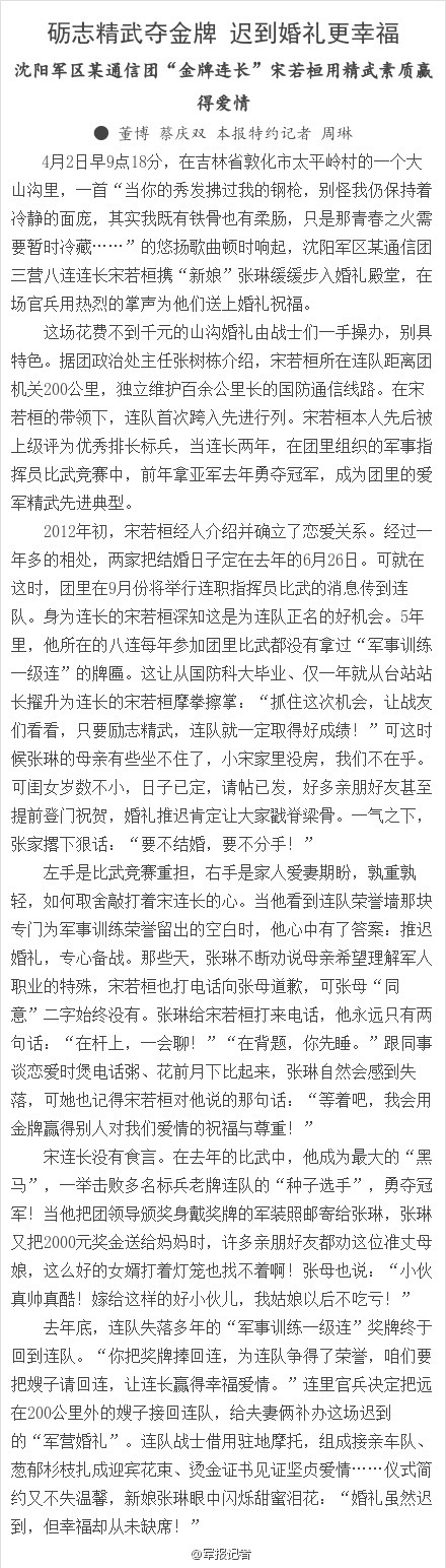 组成接亲车队,把新娘张琳接到大山脚下的连队,为他们的“金牌连长”补办了这场“迟到”的婚礼。原来宋连长与新娘张琳原定于去年6月结婚但正赶上连队比武。为了给连队挣得荣誉,宋若桓与未婚妻张琳商量将婚期延迟。