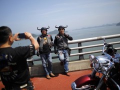 5月11日,千辆哈雷戴维森摩托车在千岛湖举行机车游行。